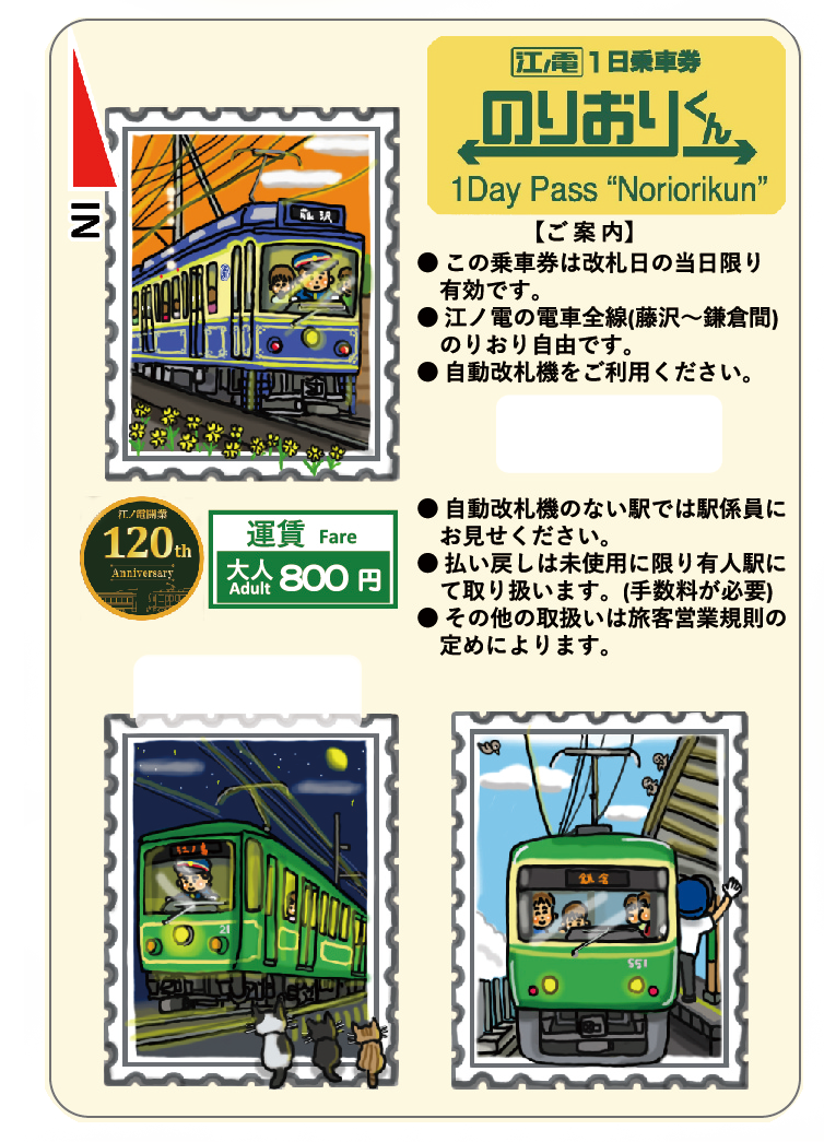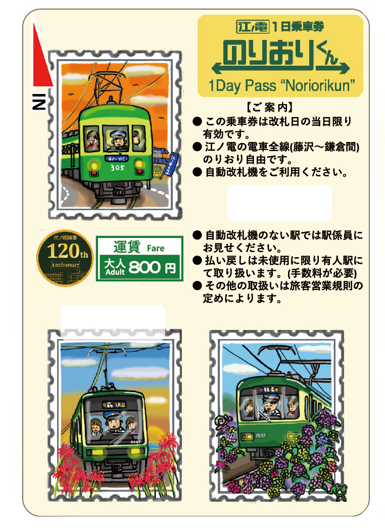 今年開業120年を迎えた江ノ電殿の記念として、一日乗車券「のりおりくん」セットのデザインを杉本聖奈が担当させていただきました。