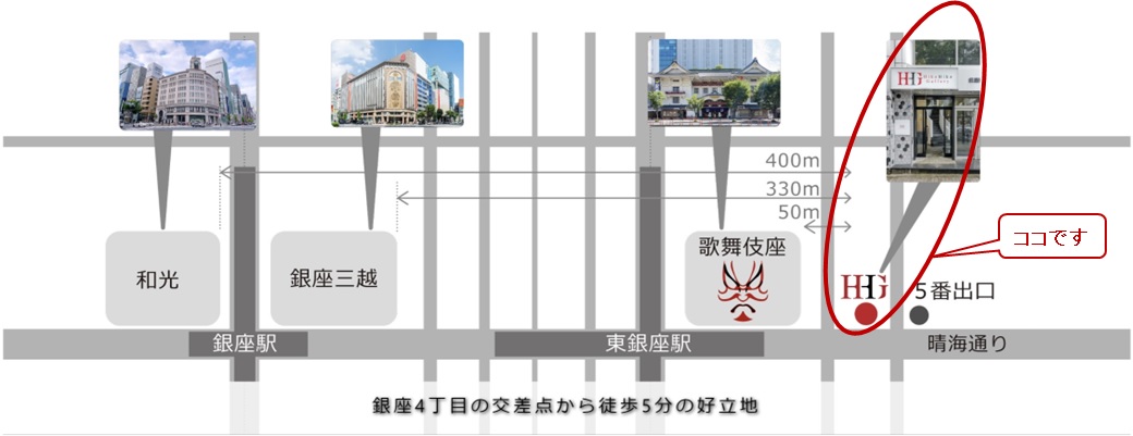 地下鉄日比谷線、都営浅草線 東銀座駅下車5番口を上がって左斜め後方のビル